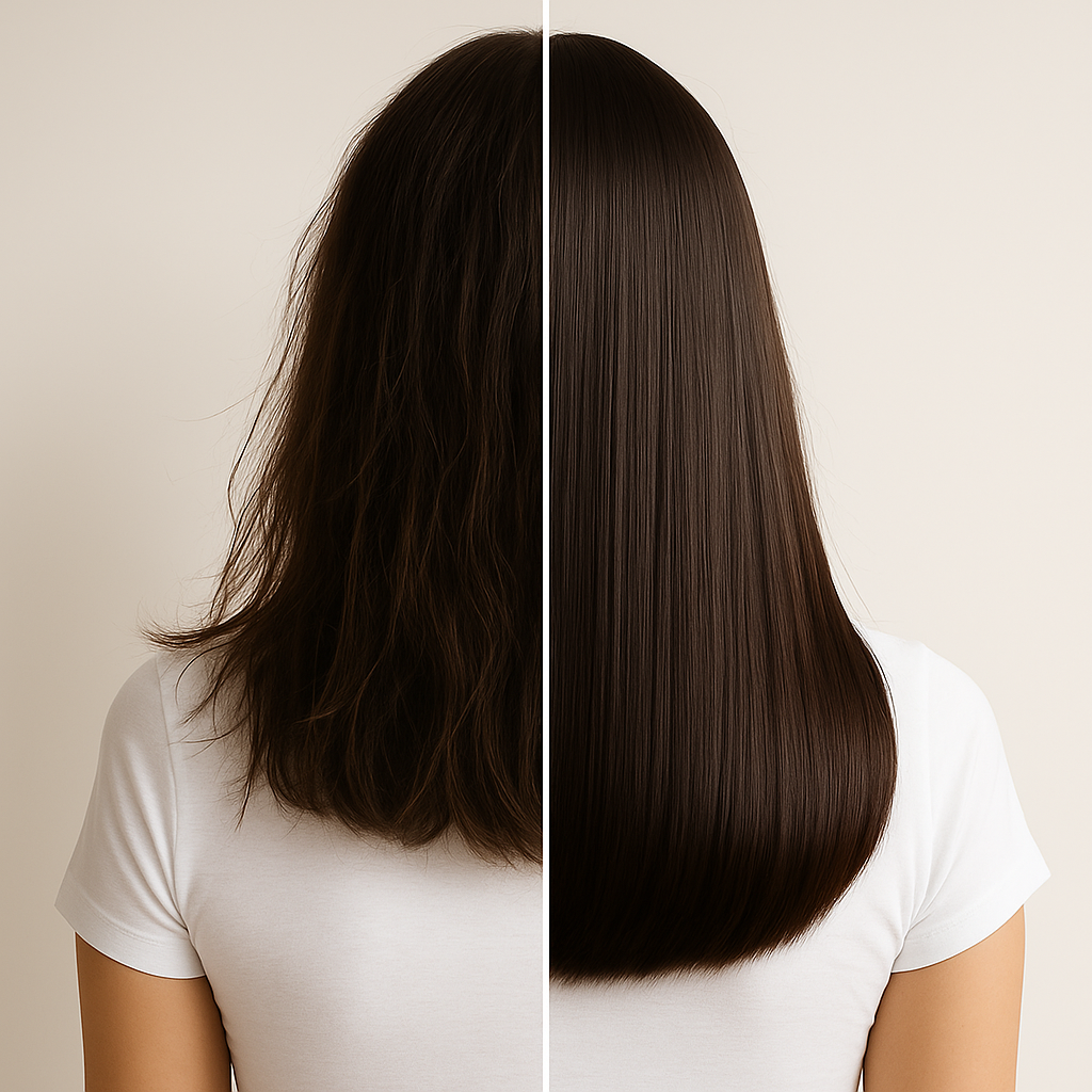Resultado: cabelos longos, fortalecidos da raiz às pontas e profundamente reconstruídos.